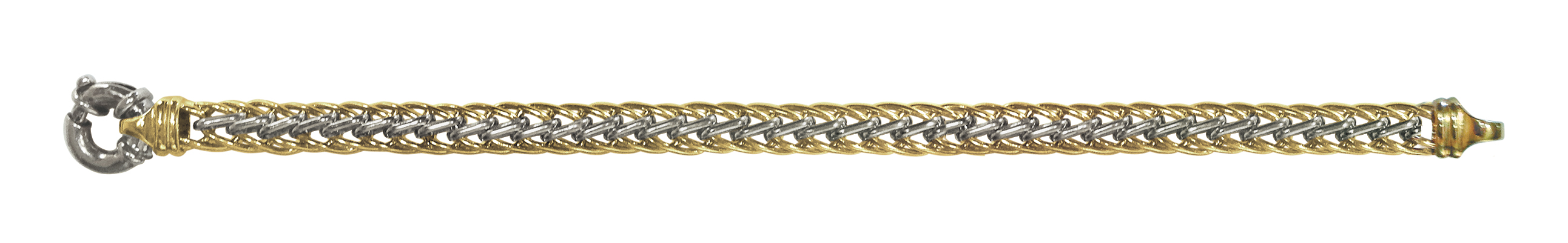 Comment:- Bismark link in yellow-gold with belcher in rose or white gold stamped 9ct in the middle of belcher with 16mm bolt ring in rose (roller design).